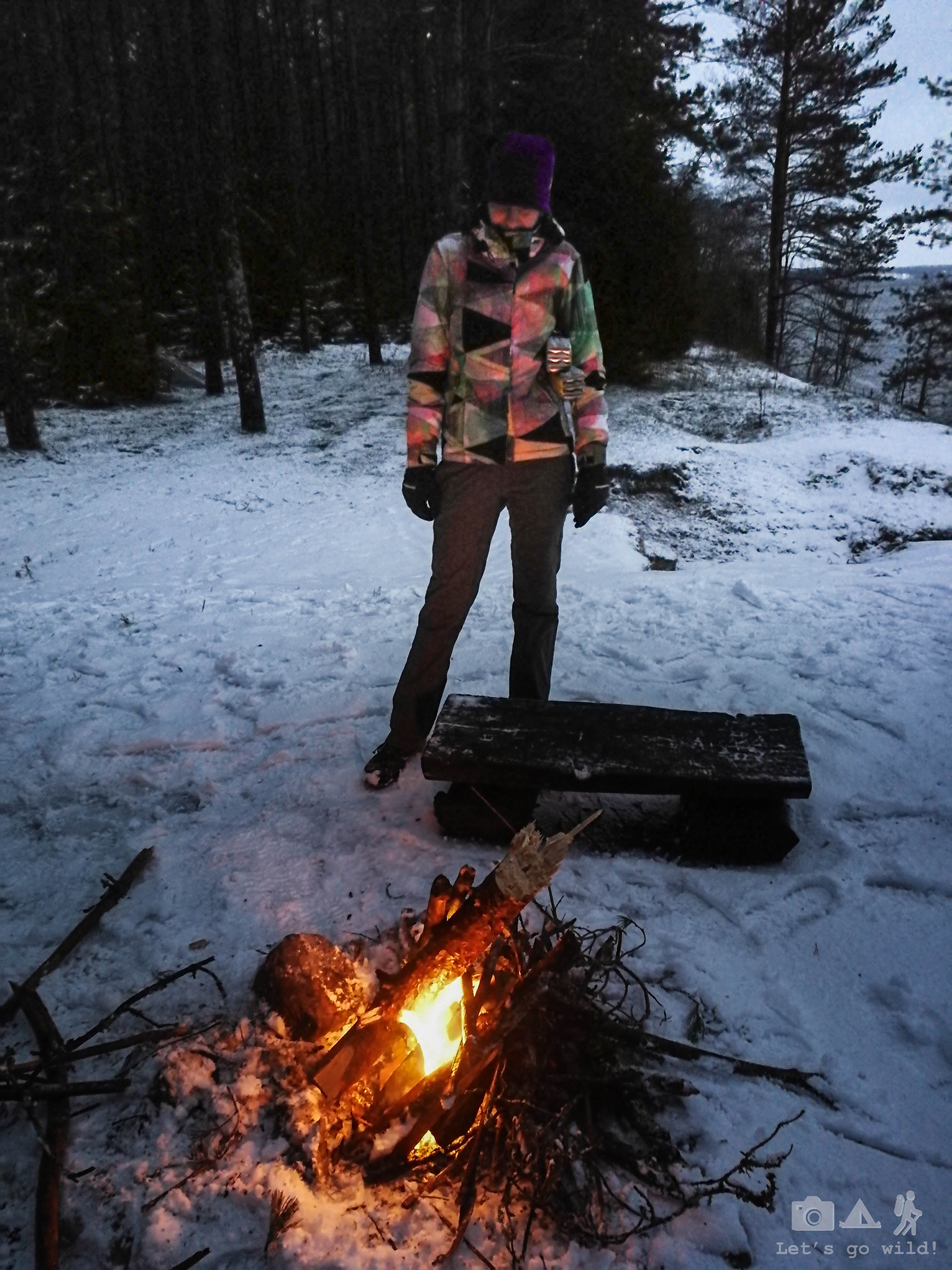 We traveled only with cabin bags so we didn’t risk taking our good gas stoves on the flight. Instead, we got the cheapest one available in Lithuania. If you ever have to camp in winter – don’t make this mistake. Good camping stoves have a system to warm up the gas before burning it, thus making your stove much more efficient. This first evening we couldn’t make the water boil with gas!!! Thank god we still had our fire burning. Even if it wasn’t strong enough to keep us warm, it had enough heat to cook our dinner.