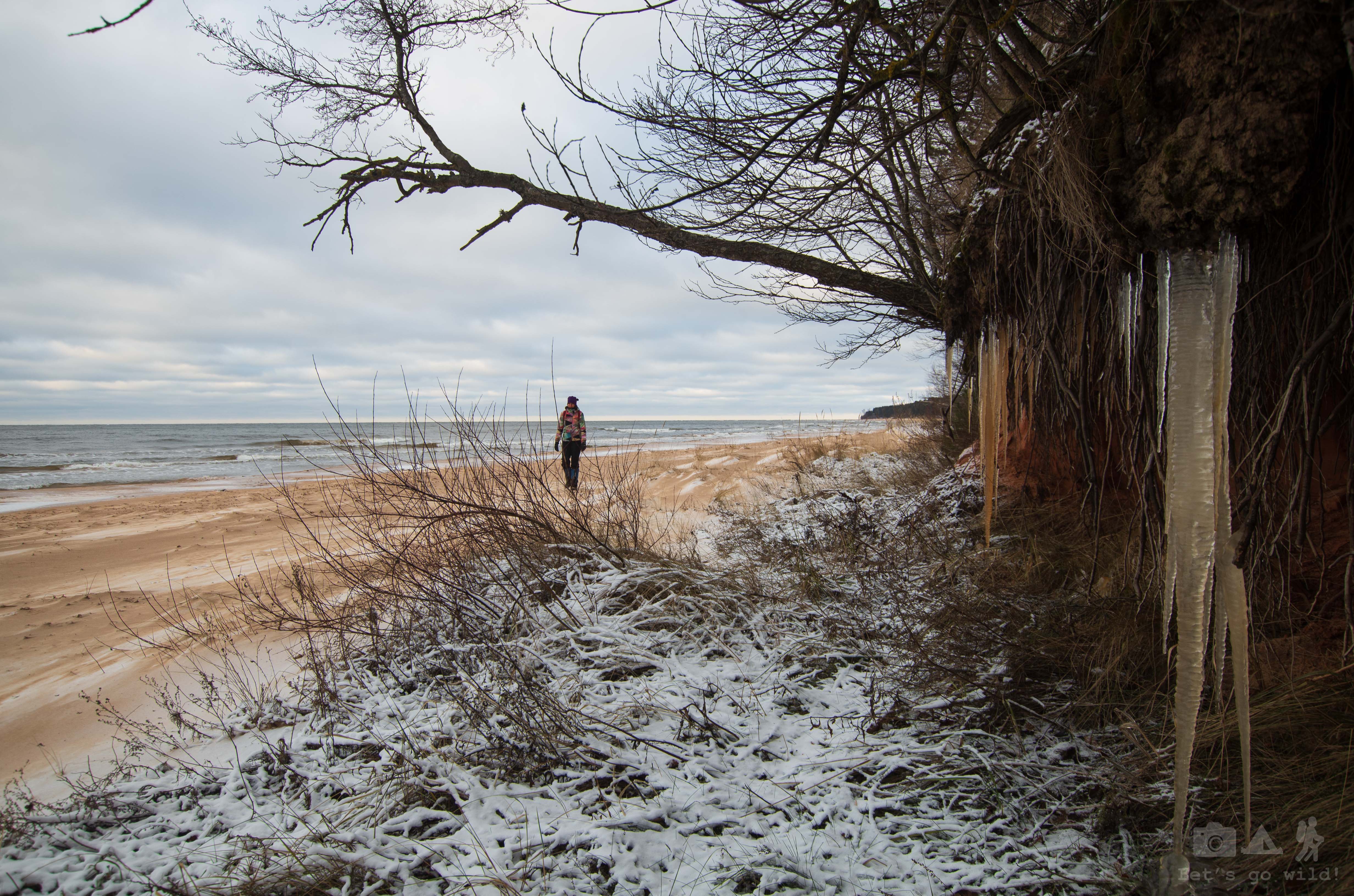 The roads were much better this morning as it stopped snowing and in a couple of hours we were greeting the Baltic sea. What a beautiful and dear view! We chose a spot to put a tent but left it for later and set of for the hike in the beach. The temperature was still showing -4, with the wind chill decreased to -13. The forecast wasn’t showing any improvement of the weather during the day.