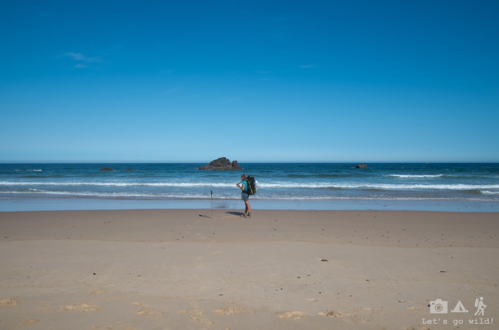 We reached the beach in just an hour walk and had to wait a bit there, as the tide was still halfway to being low. We’ve checked few times the depth of the river and the best place to cross it. Once the deepest part dropped to mid-thigh, we put our backpacks on and made a nice spectacle for the people in the beach. The two weirdoes who chose to suffer on the trail instead of relaxing in the beach all day.