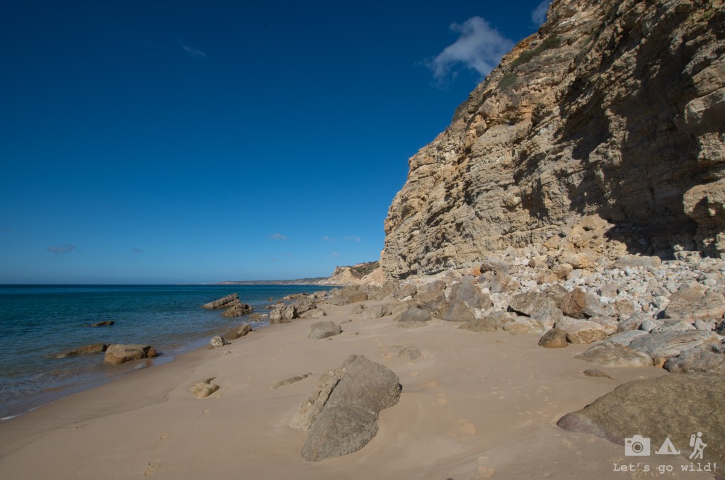 We knew there would be a steep down and up climb right in the middle of the trail from Carrapateira to Vila do Bispo and were hoping to find our sleeping place after the climb (not to have to start with it in the morning!), but once we reached this low point it was more than obvious – THIS IS THE PLACE. A small beach surrounded by fairly high cliffs was not an easily reachable place, thus not crowded and perfect to spend a night. There were only 3 couples when we arrived around 4 p.m. and it was obvious they would go back before the sunset. So, we dropped our backpacks, took off our shoes and for once went to enjoy the sand and cold water barefooted, laid down in the beach and felt like real tourists.